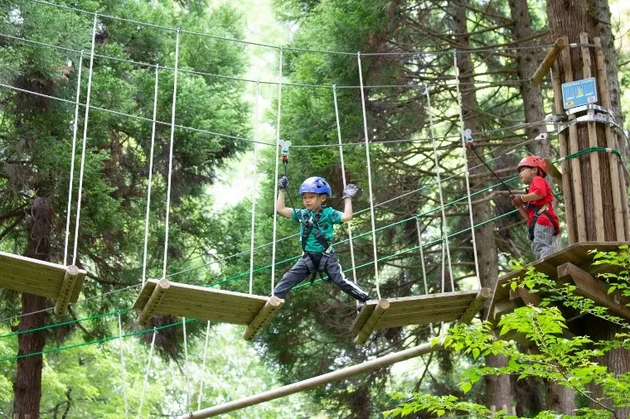 なかでも、長さ170mを越えるジップスライドは魅力のひとつです。自然のなかを滑空する爽快感をぜひお楽しみください。なお、場内の各種アクティビティは身長110cm以上が対象です。また、小学2年生までは18歳以上の保護者と一緒に参加してください。