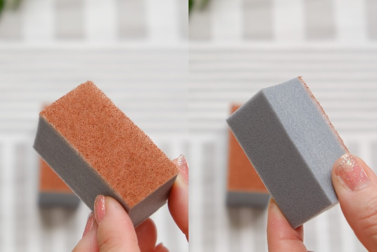 まずは粗目のスポンジを濡らして軽くこすって、洗い流してから、最後は細目のスポンジでも同じように擦って、洗い流せば完了!