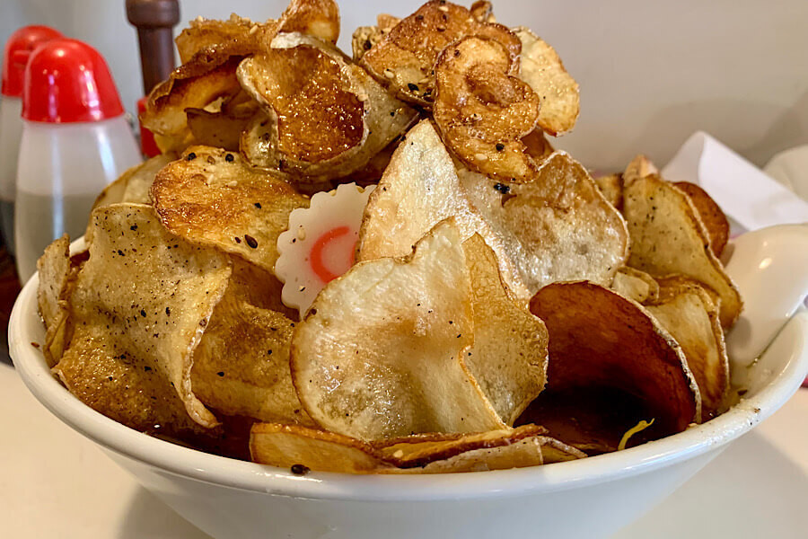 ポテチ自体も店主が作っていて、揚げたてで厚みがあってとても美味しいです。ポテチが大好きな筆者は最初喜んで食べていたのですが、いつまで食べてもポテチが減っていかないので、だんだん焦ってきました。