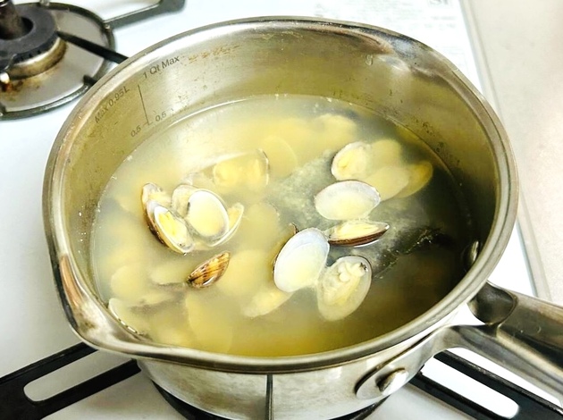 そのまま加熱していると、一般的なアサリよりは少し時間がかかりますが、しばらくするとパカッと殻が開きます。そしたら火を消します。