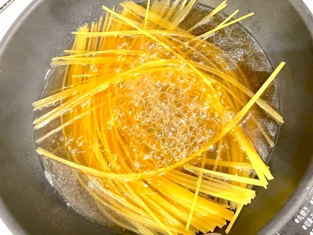 沸騰したらパスタを入れ、強火で時々全体を混ぜながら、袋の表示時間を参考に好みの仕上がりになるまでゆでます。鳥羽さんは1分前に味見をして、かたさをチェックしていました。