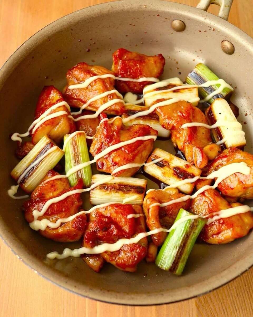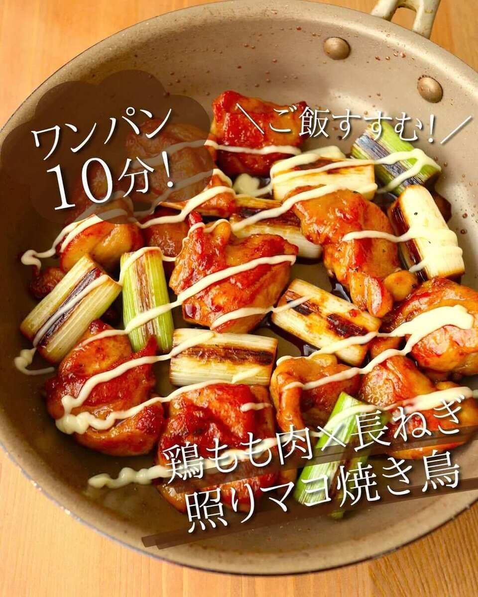 鶏もも肉とねぎを炒めて、タレを絡めるだけでつくれる超簡単レシピ。マヨネーズのまろやかなコクも合わさって、一度食べたらやみつきになります。