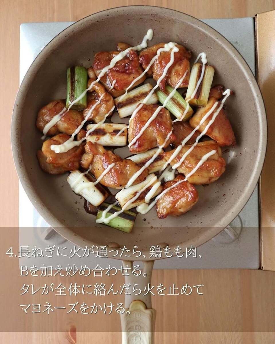 長ねぎに火が通ったら、鶏もも肉を戻し、さらに【B】を加えて炒め合わせます。タレが全体に絡んだら火を止めてマヨネーズをかけて、完成です!