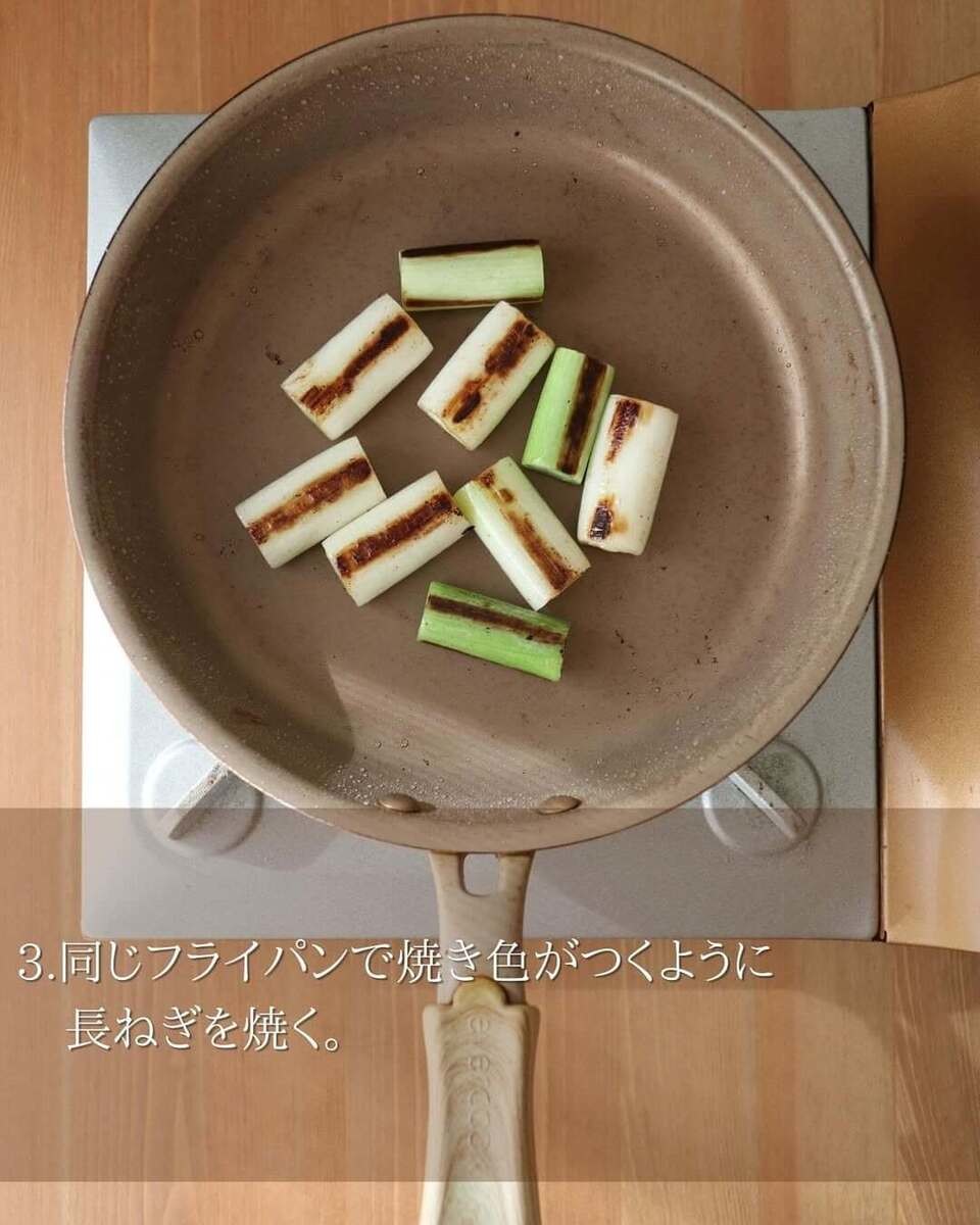 鶏もも肉を焼いたフライパンで、長ねぎを焼き色がつくまで焼きます。