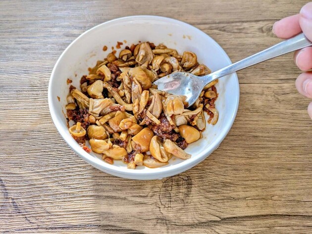 なめこを粗く刻み、①と混ぜ合わせましょう。なめこは、ある程度大きいところが残っている方が、プリプリとした食感が楽しめます。