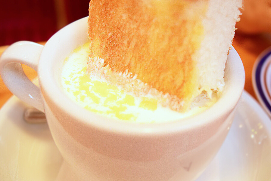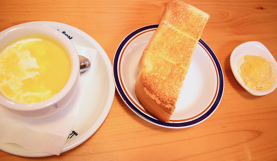 トーストをコーンスープにたっぷりと浸していただくつけパンスタイル。濃厚で塩っ気のあるコーンスープがトーストに染み込んで、クセになる味わい。マナー的にどうなのか微妙ですが、何度でも試したくなります。