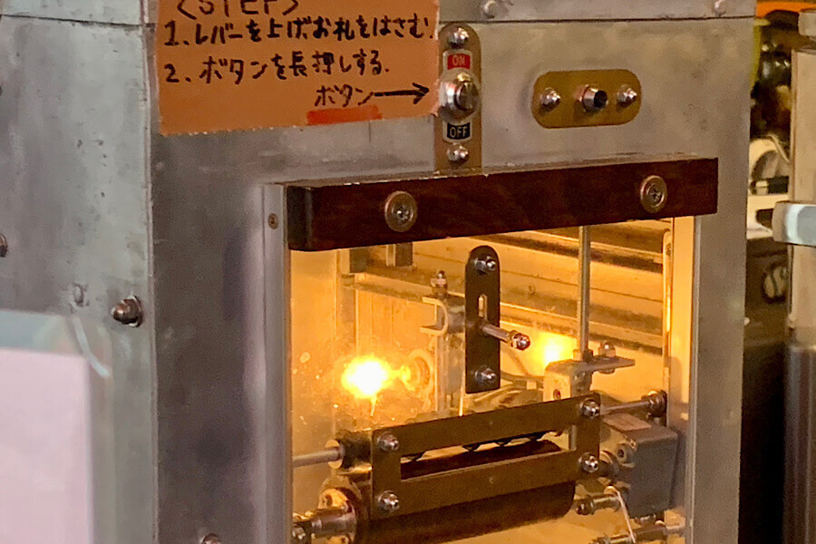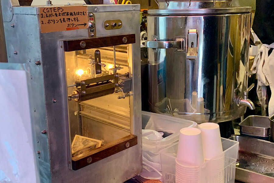 やっと行列の先頭にくると、お店の入口に「支払い機」があり、そこで千円を前払いします。この支払い機、学校の夏休みの宿題で誰かが持ってくるような超アナログなものです。