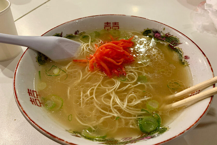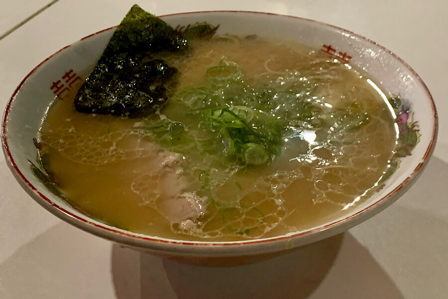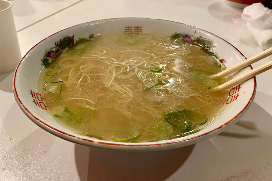 慣れたお客さんは、何回も替え玉をするとスープが薄まってしまうので、水用の紙コップにスープを残しておいて替え玉をしたらスープを戻す、という裏技を使いながら食べていました。
