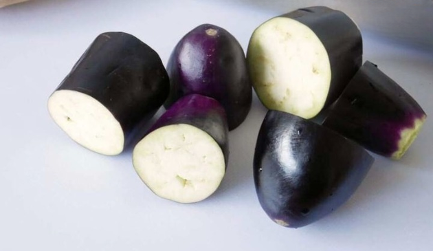 なすはヘタを切り落とし、4~5cm長さの筒状に切ります。水に浸けてアクを抜きましょう。