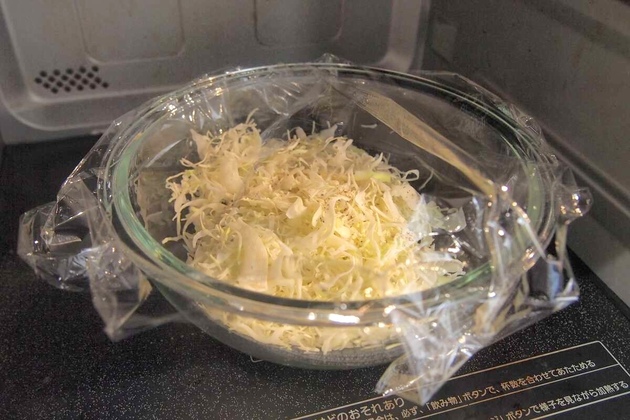 耐熱ボウルに千切りにしたキャベツを入れ、塩、こしょうをふります。