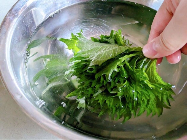 水カップ2+1/2に塩大さじ1を混ぜて作った塩水に、青じそを10分間つけ、水けを切りましょう。