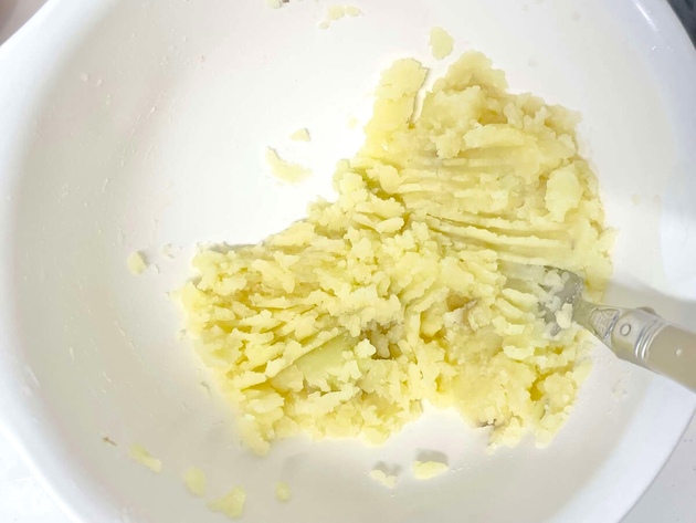 フォークを刺してスッと入るくらい柔らかくなったら、皮をむいてフォークで粗くつぶします。