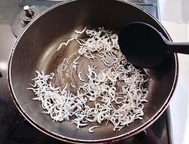 作り方①鍋にごま油をひき、ちりめんじゃこを炒める