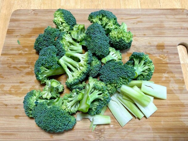 ブロッコリーを小房に切って、水気がある場合はキッチンペーパーなどで拭きます。