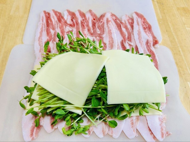 さらに、チーズ、豆苗、チーズの順番でのせていったら、豚バラ肉でチーズと豆苗をくるくると巻きます。