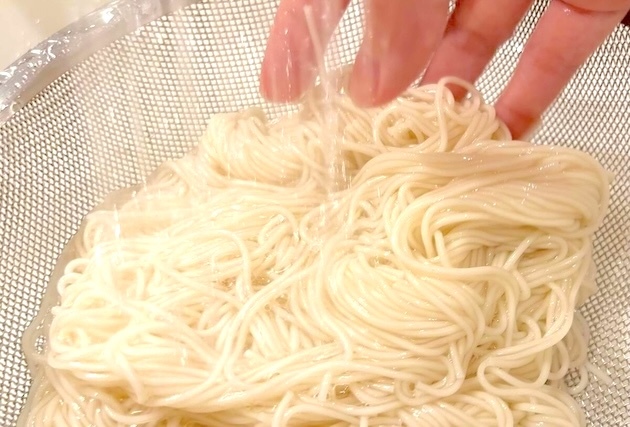そうめんを袋の表示時間通り茹でたらざるにあげて、水でよくもみ洗いをしたら水気を切ります。