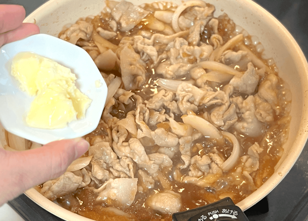玉ねぎが透き通ってきたら、具材を端に寄せて空いたところに特製だれを加えて強火にします。