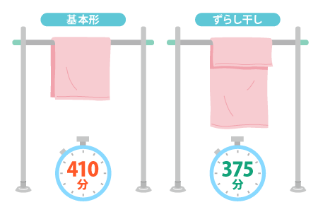 バスタオルの乾く時間を基本形(真っ二つに折った干し方)とずらし干し(前後をずらした干し方)の2つの干し方で比較すると(東京における1月の昼間の気温・相対湿度の平年値に近い状態で実験)、基本形は410分だった一方で、ずらし干しは375分と、35分の違いがありました。