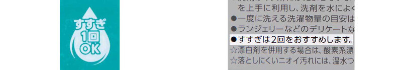 使っている洗剤のおすすめのすすぎ回数を確認する際は、「洗剤容器の裏面等」を見ます。「すすぎ1回のお洗濯」ができるのは、裏面に「すすぎ1回OK」マークや「すすぎ1回」の文字が入っている洗剤です。