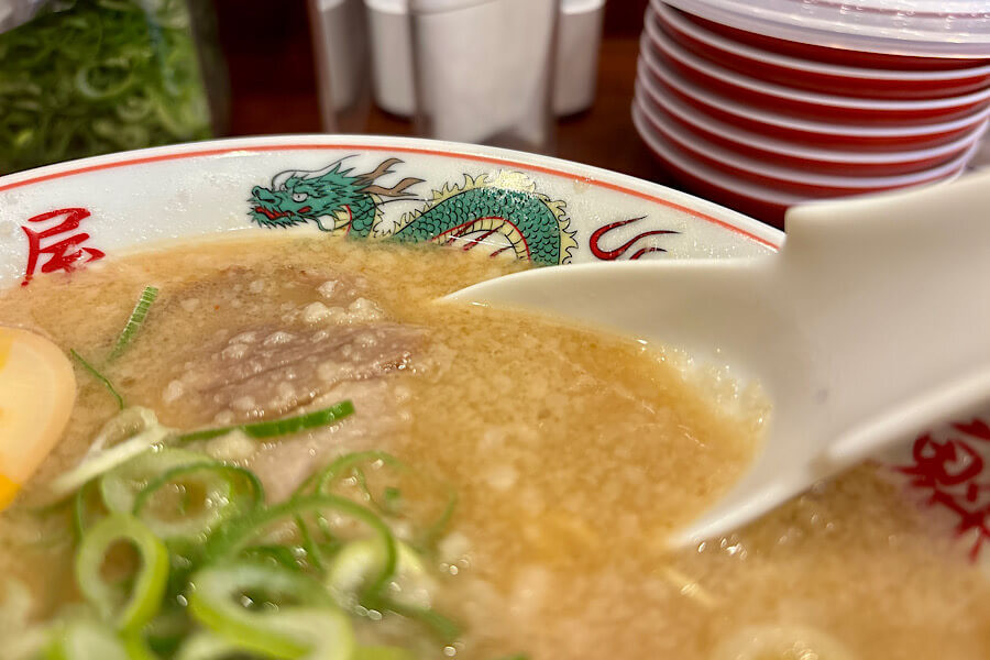 まずはひと口スープを飲むと、コク旨です!濃厚な出汁の味としょうゆが最高のハーモニーを生み出しています。背脂が入っていますが、全然しつこくありません。