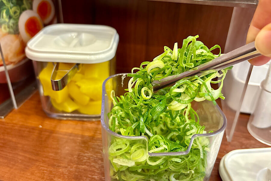 席に蓋つき容器で備えてあるので、好きなだけとって丼ぶりに入れます。濃厚なスープにネギの青い感じの香りとシャキシャキ感が合い、ラーメンがあっさりします。