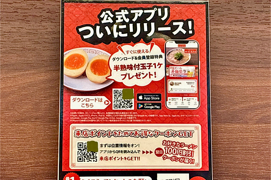 訪問直前に魁力屋のスマホアプリがあることを知り、インストールして見てみると、アプリインストールをした人には味玉が1つ無料(1回のみ)とあるではありませんか。これは入れない手はありません。