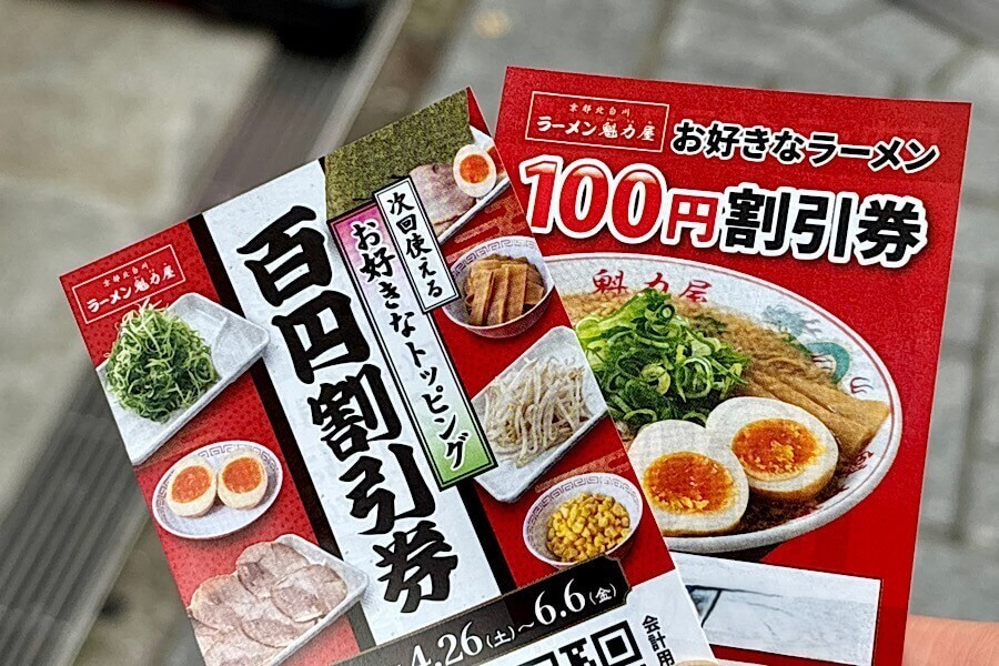 また、会計時に100円引きのクーポンや、2025年6月7、8日にラーメンを一杯食べるとラーメンの無料券がもらえる案内ももらいました。次の訪問日程は決まりですね。