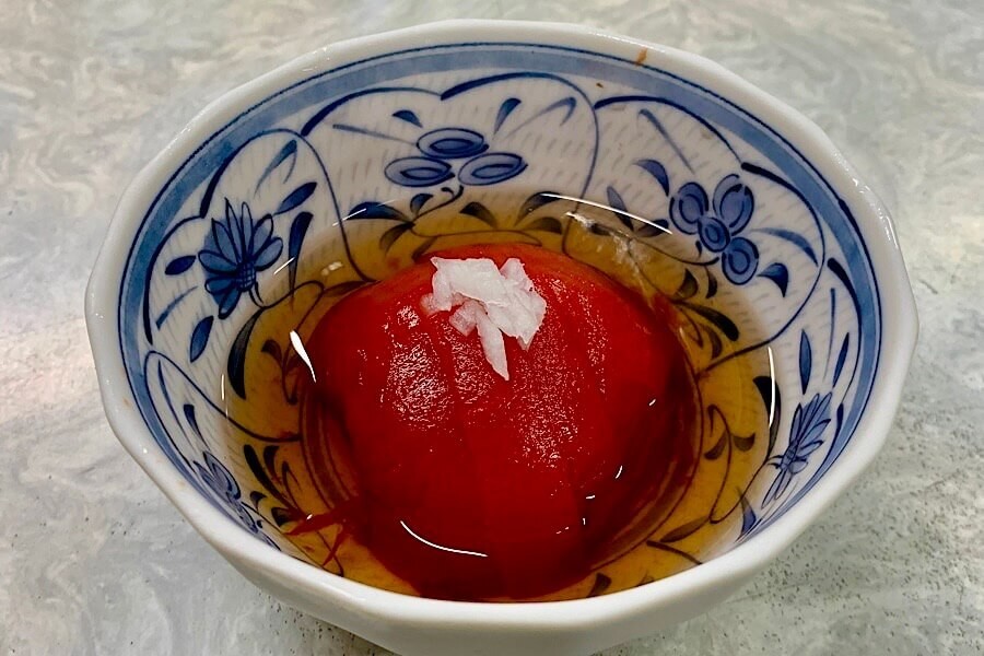 酢の酸味がまろやかで、出汁が効いている酢漬けです。トマトの旨味もあって美味しく、このメニューのファンになりました。