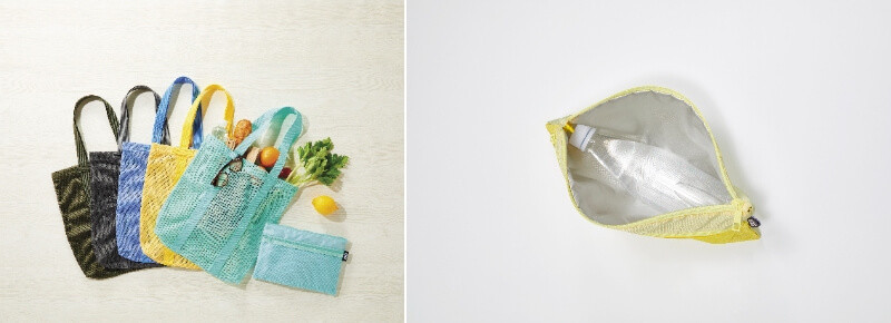 トートバッグは涼しげなメッシュ素材で、サングラスをかけられるフック付き。保冷ポーチは飲み物や軽食を入れて持ち歩ける、初夏のレジャーシーンにぴったりの便利グッズです。