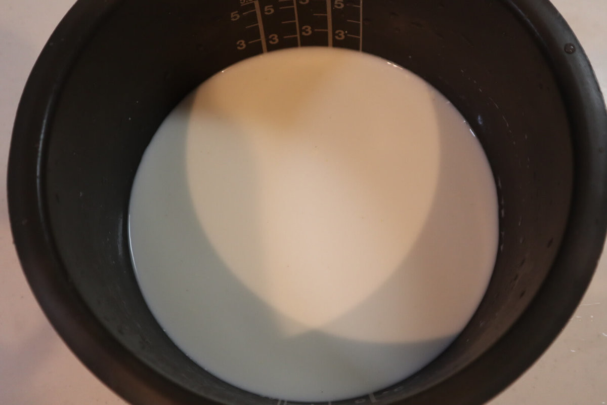 ②炊飯器に問いだ米、牛乳、水、鶏ガラ、塩を入れてよく混ぜ合わせます。