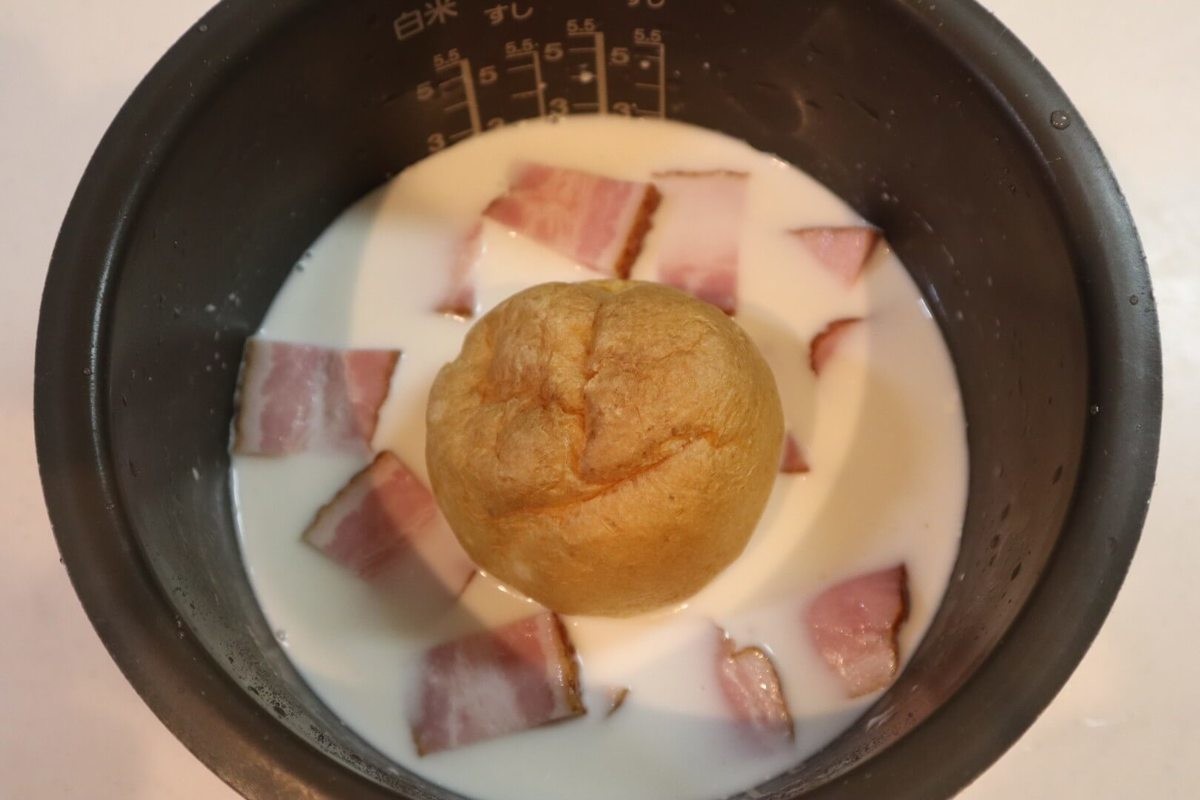 ③その上にベーコンとシュークリームを乗せて、通常通りに炊飯すれば完成です(早炊き炊飯はお米に芯が残りやすいので、必ず通常炊飯にして下さい)。