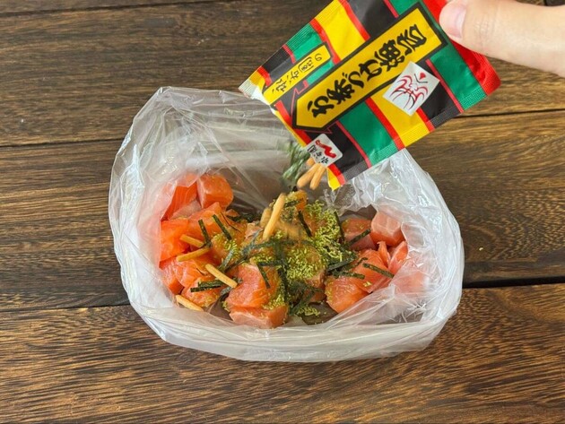 一口大よりも少し小さめに切ったサーモンとお茶づけ海苔をビニール袋に入れて、軽くもみましょう。
