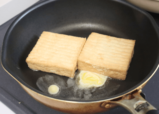 フライパンにバターを入れて中火に熱し、厚揚げをこんがりと両面焼きます。