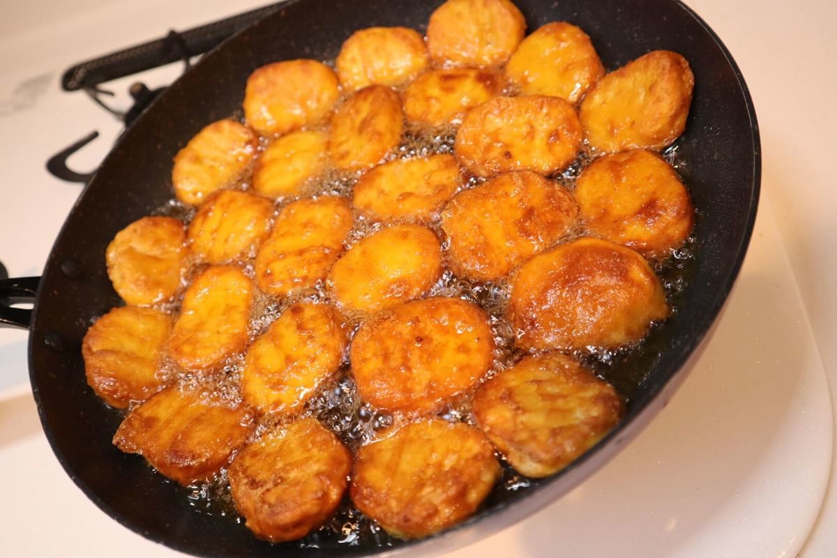 ①冷凍ナゲットを180℃の油で4分、カラッと揚げます。
