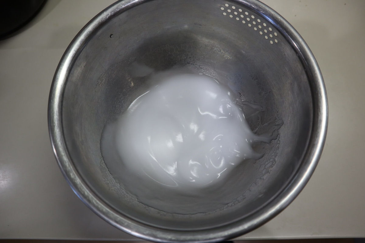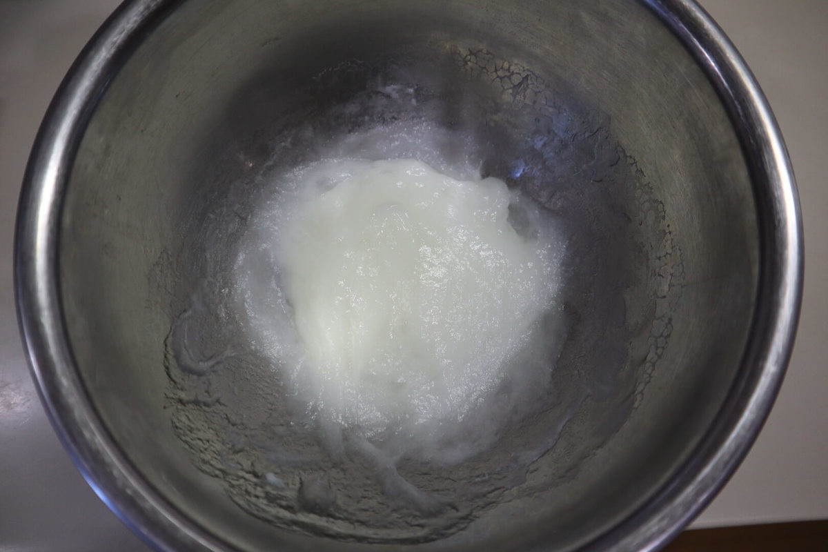 ①片栗粉を入れたボウルに、少しずつ熱湯を加えながらよく混ぜます。片栗粉に火が通って透明にならなかった場合は、電子レンジ500wで10~20秒ほど加熱します。