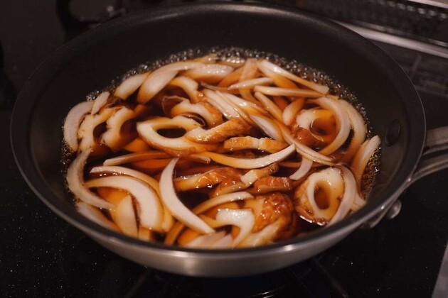 ➁フライパンに【A】と➀を入れて中火にかけ、玉ねぎがしんなりするまで煮ます。