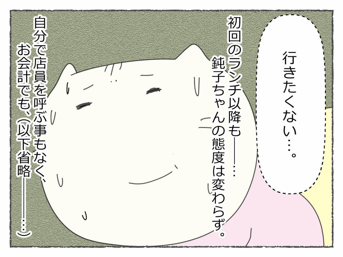 今回は「地獄の誘い編」。初回のランチから数日経った頃、ヤバイ女"鈍子(どんこ)"からお出かけしようとの誘いが。仲良くなるかもしれないと渋々承諾した、作者と同僚の優子でしたが……!?