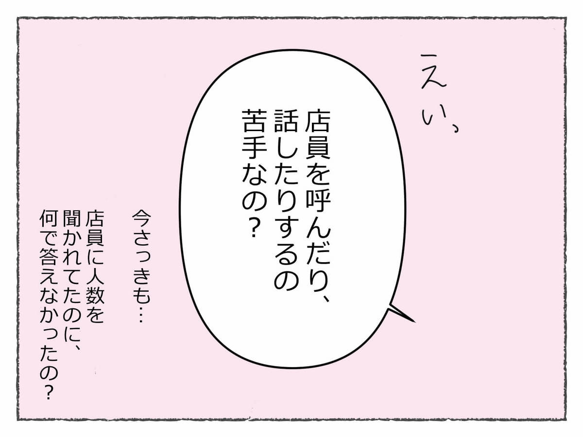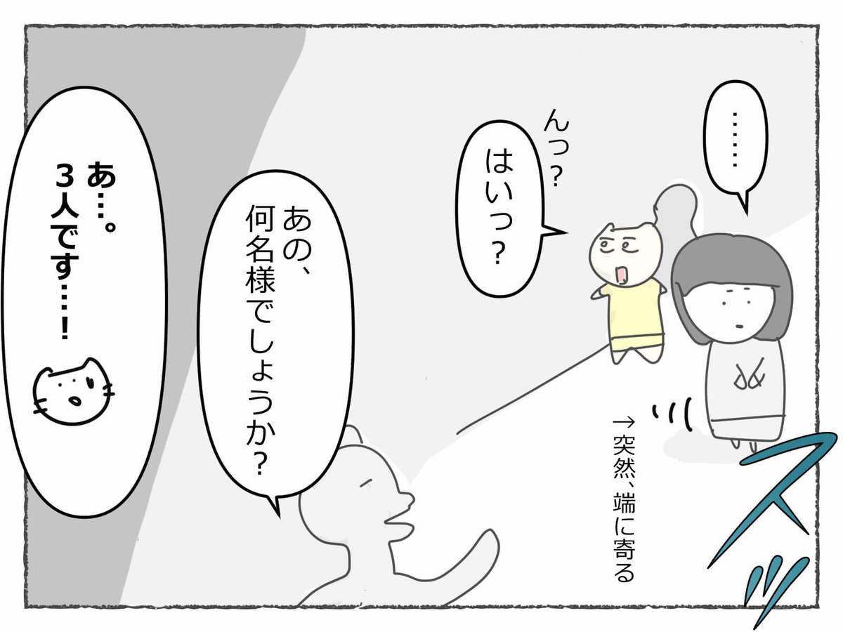 え、店員さんが人数を聞いていたのに、聞こえていない……??じゃあなんで隅に隠れたの!?