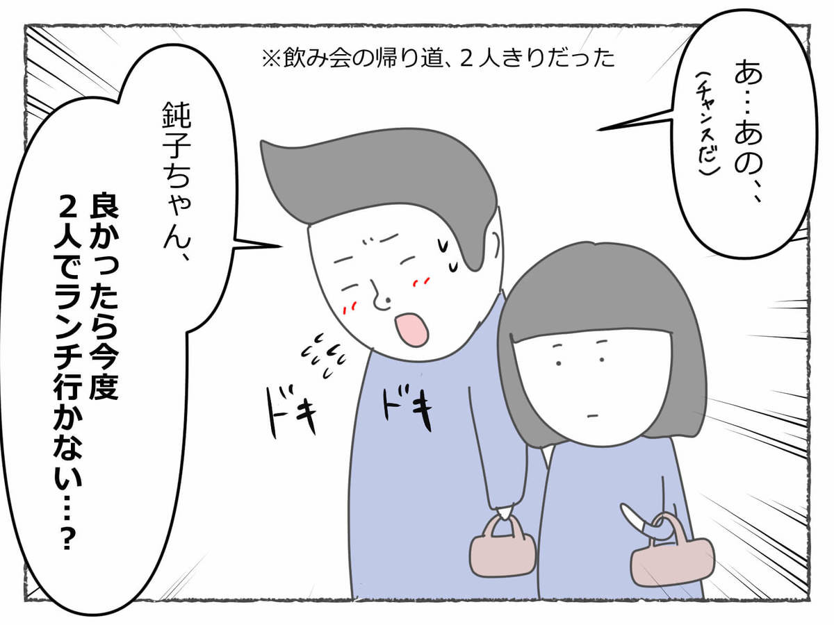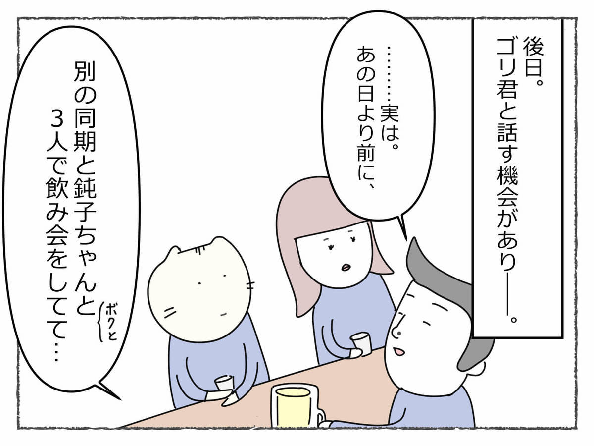 今回は「ゴリ君の涙編」。ヤバイ女"鈍子(どんこ)"に片思いしている同期のゴリ君とのランチ会が終了。後日、作者と同僚の優子はゴリ君と話す機会があり、ランチ会が開催されるまでの衝撃的な真実を聞く……。驚くべきその内容とは!?