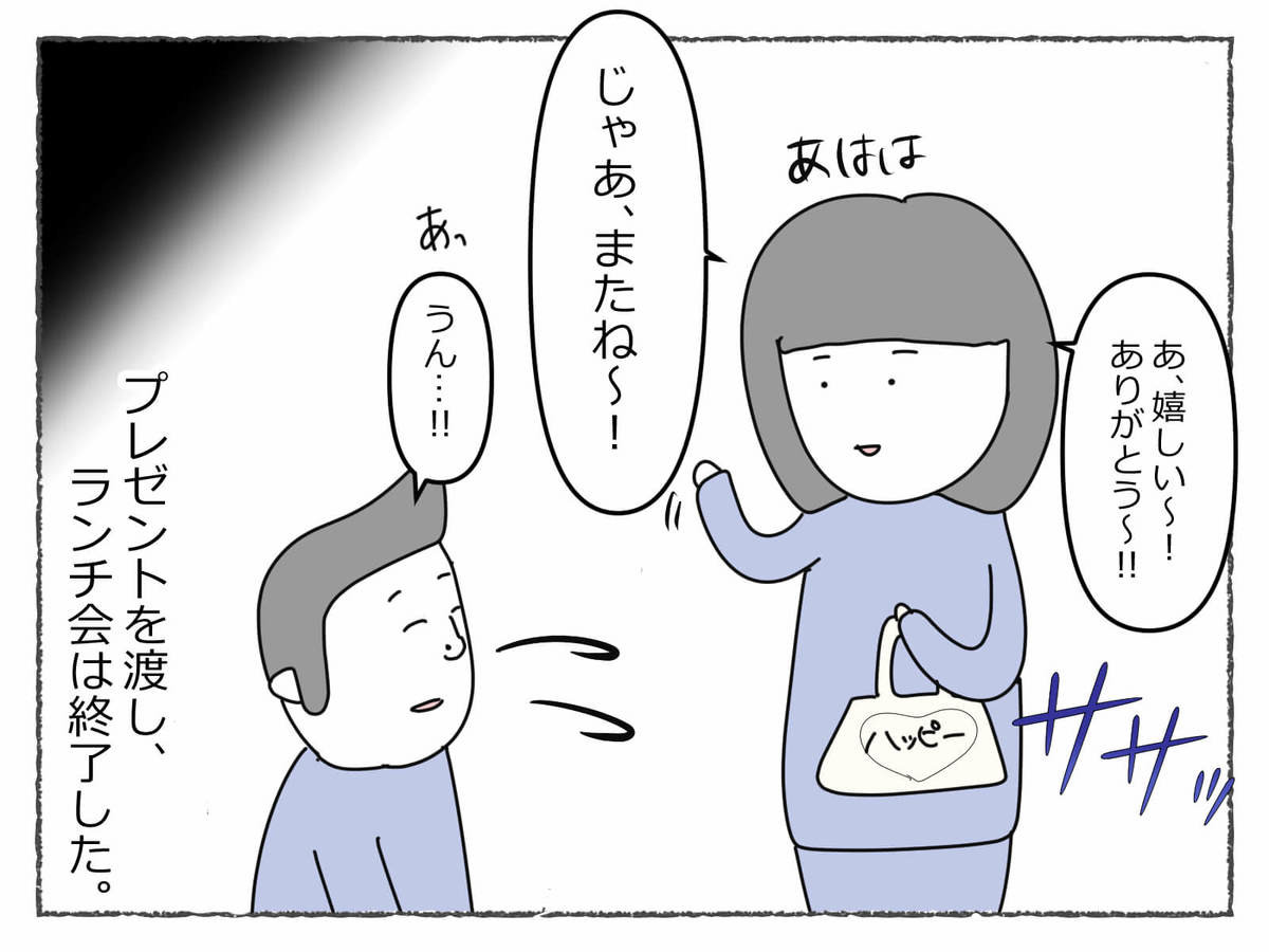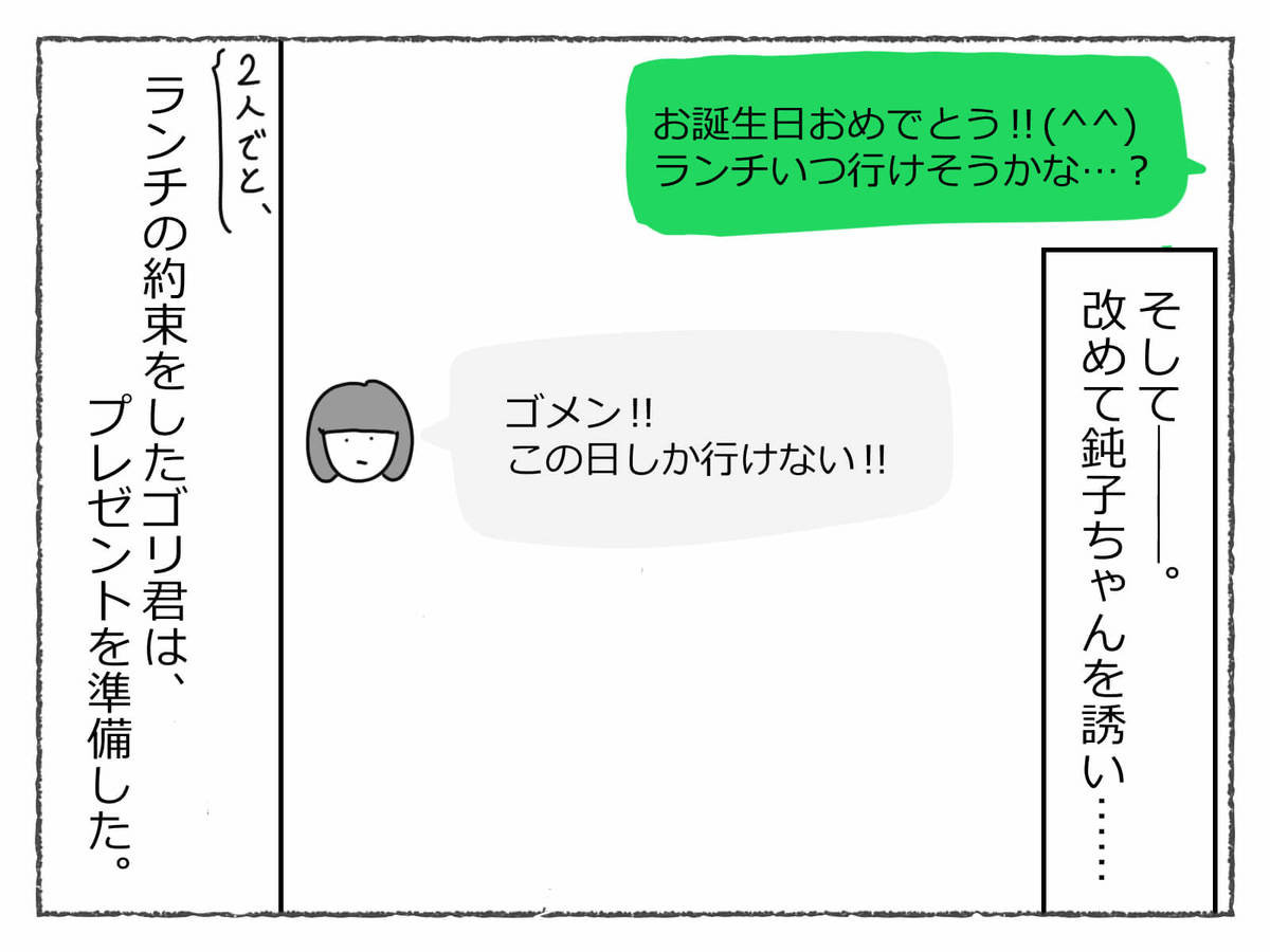 さりげなく誕生日プレゼントまで買わせていた鈍子に、開いた口がふさがりません……!しかもゴリ君は“2人”でランチに行こうって言っていたのに……。