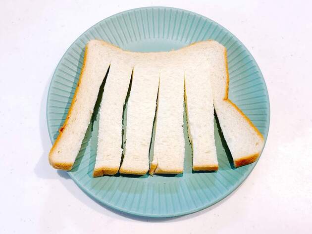 切り方はこう。食パンの片側だけがくっつくような状態で、スティック状の切り込みを入れます。