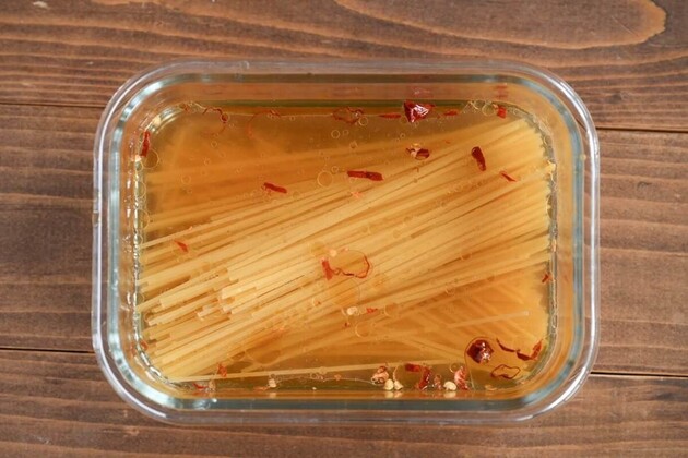 スパゲティを半分に折り、①に入れて調味料に沈めます。