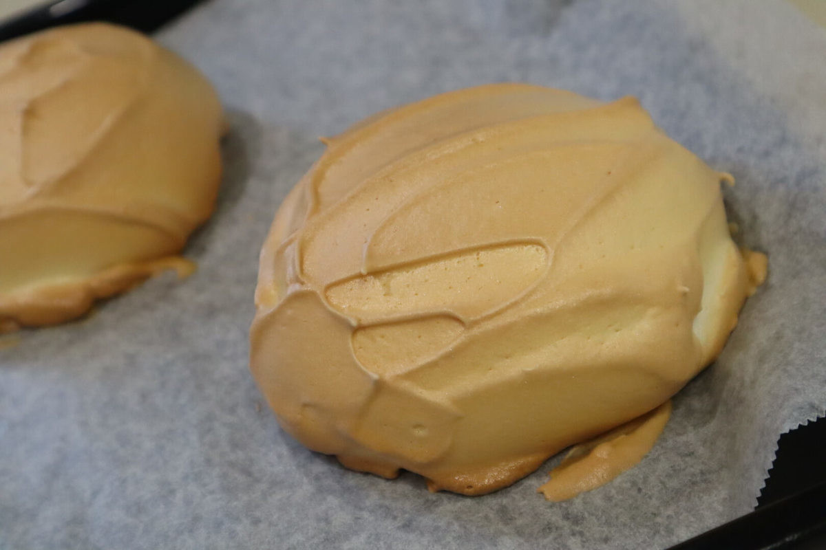 ④天板にオーブンシートをしき、メロンパンの形のように丸く広げます。
