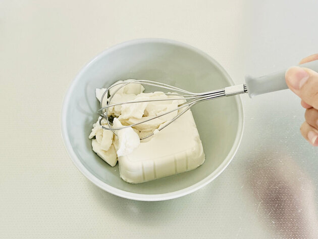豆腐を深めの器に入れ、泡だて器で混ぜます。