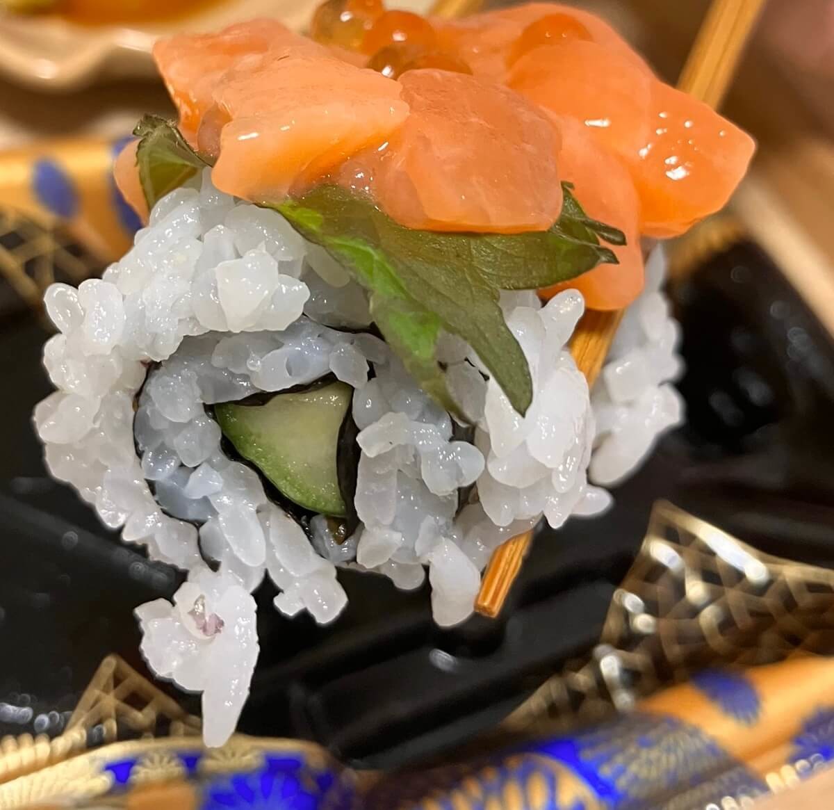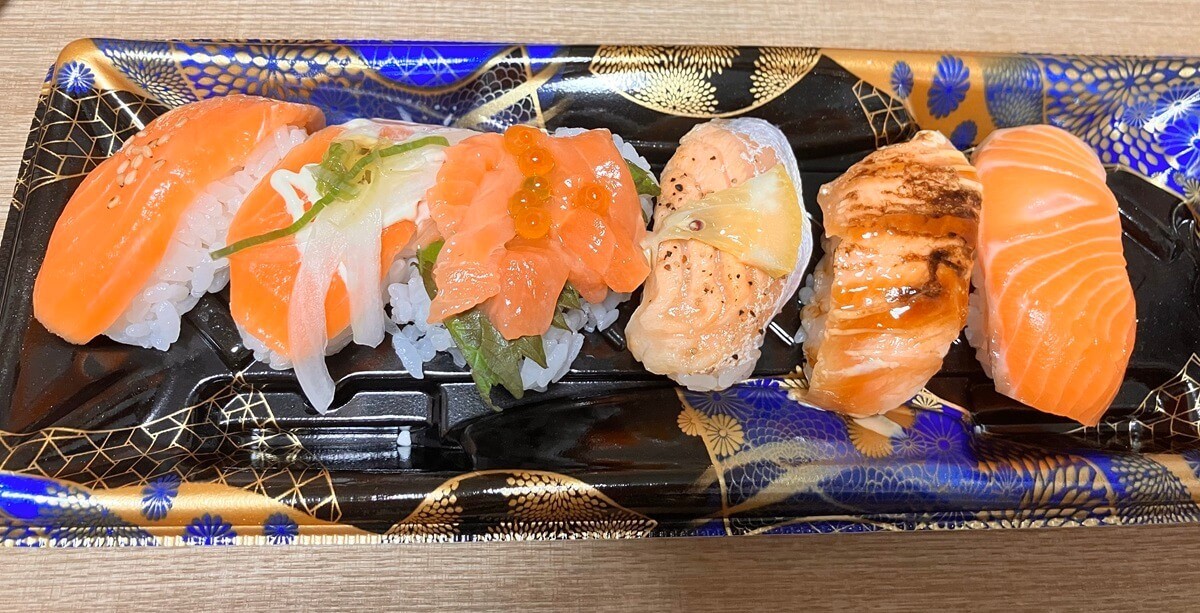 漬けサーモン、炙りサーモンなど、バラエティに富んだ6種類が入っています。どのお寿司も、程よく脂がのっていて、口の中でとろけます。