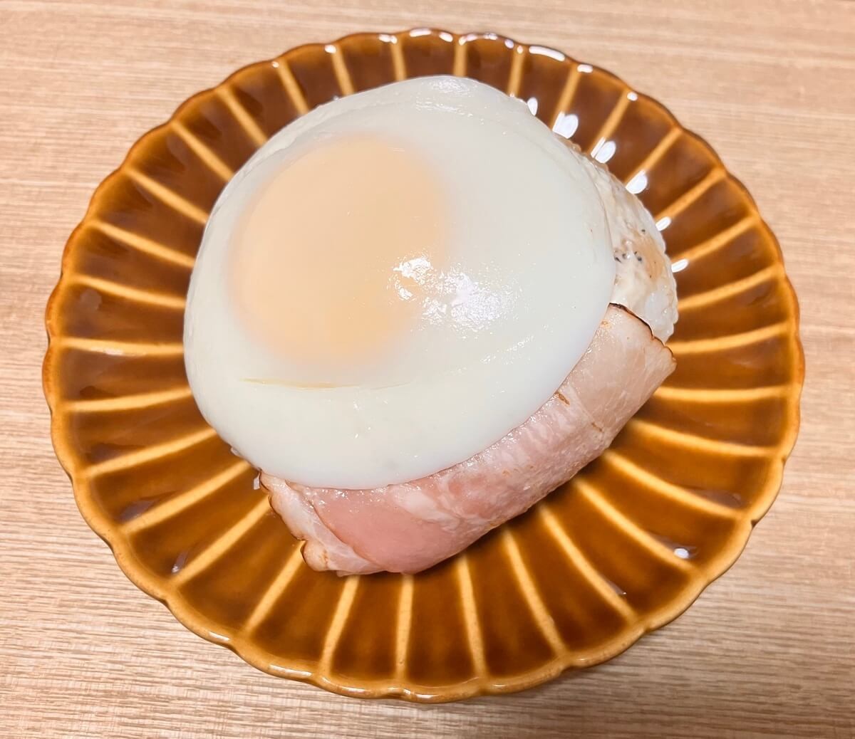 この白いものの正体は、目玉焼きです。その下には炙りベーコン。ご飯をベーコンエッグで巻くという、斬新な商品です。