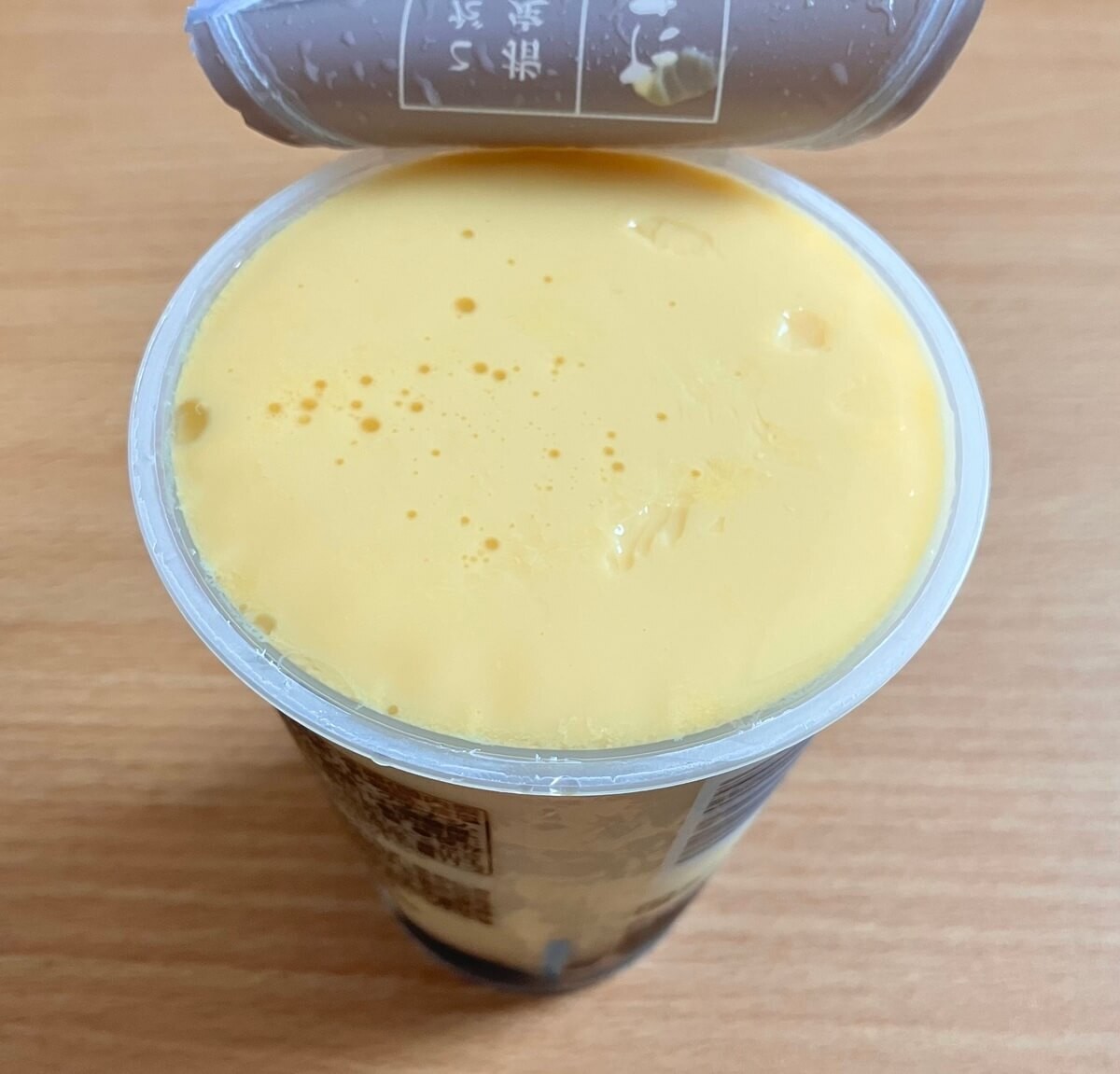 「こだわりたまご使用」の文字に、わくわくして蓋をめくると、さらにびっくり。カップのぎりぎりまでプリンがぎっしりつまっています。