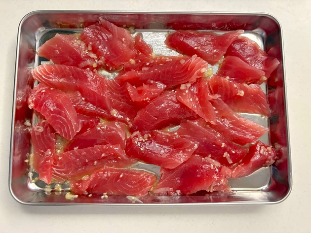 ※筆者はまぐろ200g分を2柵で購入しています。また、にんにくはチューブタイプのにんにくを小さじ1/2で代用しました。