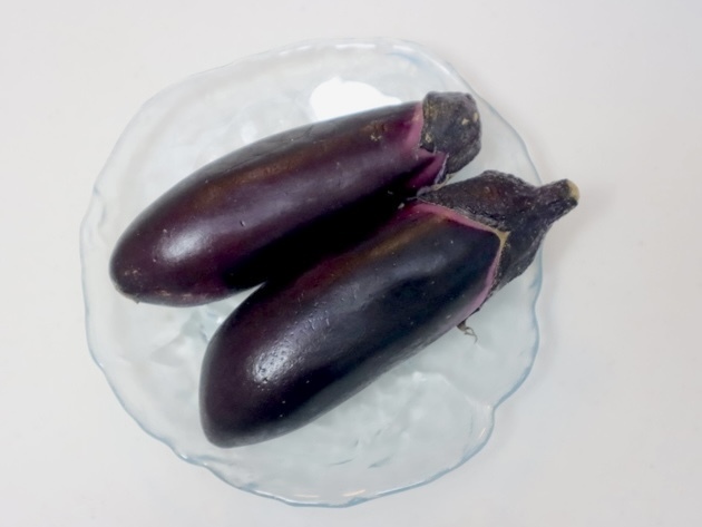 ナスは太さに合わせて縦に4~6等分し、横半分に切ります。