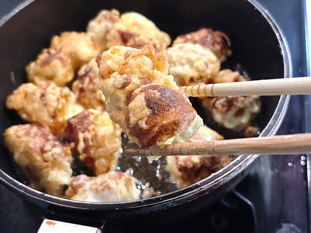 真ん中だけ色のついた比較的細い「生ちくわ」ではなく、太くて丸い焼き色が全体についている「焼きちくわ」を使うことで、大きくて食べ応えのあるから揚げを作ることができますよ。